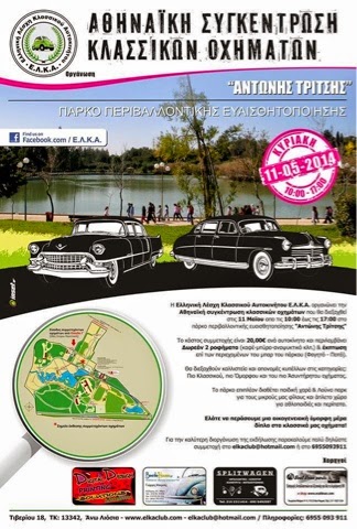 Η Ελληνική Λέσχη Κλασσικού Αυτοκινήτου Ε.Λ.Κ.Α ανακοινώνει την Αθηναϊκή συγκέντρωση κλασσικών οχημάτων που θα διεξαχθεί στις 11 Μαϊου απο τις10:00π.μ μέχρι τις 17:00 μ.μ στο πάρκο περιβαλλοντικής ευαισθητοποίησης “Αντώνης Τρίτσης”