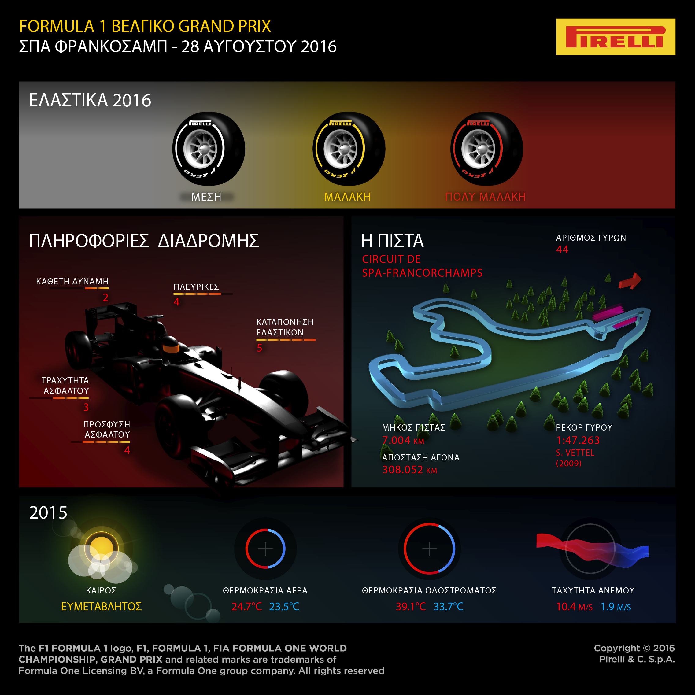 Μετά τη μικρή καλοκαιρινή ανάπαυλα η Formula 1 επιστρέφει σε μια επική διαδρομή για τους οδηγούς: Το Σπα Φρανκοσάμπ στο Βέλγιο. Οι γόμες P Zero, μέση/μαλακή/πολύ μαλακή επιλέχθηκαν για τον μεγαλύτερο σε απόσταση γύρο πίστας που απαντάται μέσα στην χρονιά (7.004m). Κατά τη διάρκεια ενός γύρου σε πολλά σημεία μεταφέρονται υψηλά ενεργειακά φορτία διαμέσου των ελαστικών. Στην πραγματικότητα το Σπα Φρανκοσάμπ θέτει μια πραγματική πρόκληση για τα ελαστικά και κατ’ επέκταση για ομάδες και οδηγούς. Η ιστορική πίστα στους πρόποδες των Αρδεννών είναι γνωστή για το ευμετάβλητο του καιρού. Το τοπικό μικροκλίμα προσθέτει μια ακόμη παράμετρο την οποία πρέπει να συνυπολογίζουν οι υπεύθυνοι στρατηγικής.