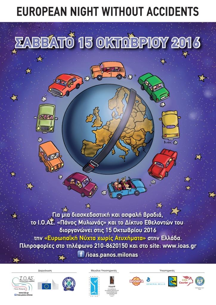 Το Ινστιτούτο Οδικής Ασφάλειας (Ι.Ο.ΑΣ.) «Πάνος Μυλωνάς» διοργανώνει για 10η συνεχόμενη χρονιά, το Σάββατο 15 Οκτωβρίου 2016 την πολύ επιτυχημένη ενέργεια «Ευρωπαϊκή Νύχτα χωρίς Ατυχήματα» σε 27 πόλεις της Ελλάδας, ταυτόχρονα με τη μεγάλη Πανευρωπαϊκή διοργάνωση. Κύριος στόχος της εκδήλωσης είναι η ενημέρωση και ευαισθητοποίηση κοινού και οδηγών για την Οδική Ασφάλεια, με ιδιαίτερη έμφαση στους νέους και κεντρικό μήνυμα ότι «το αλκοόλ και η οδήγηση δεν πάνε μαζί».