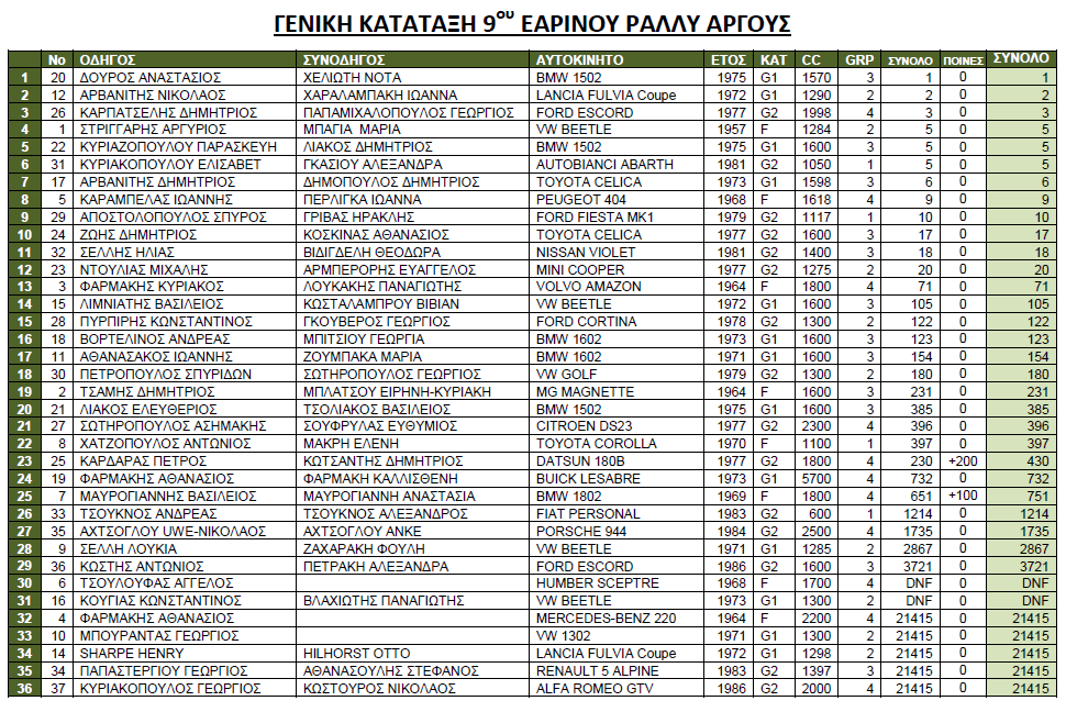 Το 9ο Εαρινό Ράλλυ Άργους “Νίκος Τσάμης” τελείωσε με απόλυτη επιτυχία. Όλοι οι συμμετέχοντες ευχαριστήθηκαν τον αγώνα ο οποίος υπήρξε συναρπαστικός και πολύ ενδιαφέρον. Τα αυτοκίνητα αφού διένυσαν 130 περίπου χιλιόμετρα μέσα από όμορφες διαδρομές και εκτελώντας 8 ειδικές δοκιμασίες, κατευθύνθηκαν και τερμάτισαν στο Κεφαλάρι όπου και πραγματοποιήθηκε γεύμα και απονομή.