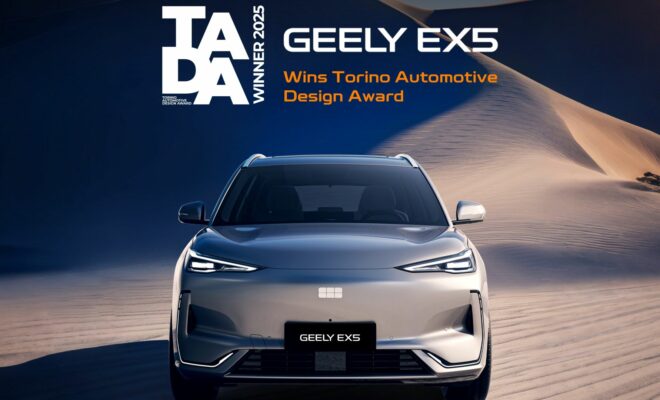 Η υπεροχή της εταιρείας στον σχεδιασμό επιβεβαιώθηκε περαιτέρω, καθώς το Geely EX5 κατέκτησε το βραβείο σχεδίασης στην τελετή απονομής των Torino Automotive Design Award (TADA), προσθέτοντας μια ακόμη διεθνή διάκριση σε ένα εντυπωσιακό χαρτοφυλάκιο που περιλαμβάνει τα German Red Dot Design Award, A’ Design Award (Ιταλία), IDA International Design Gold Award (ΗΠΑ) και MUSE Platinum Award (ΗΠΑ).
