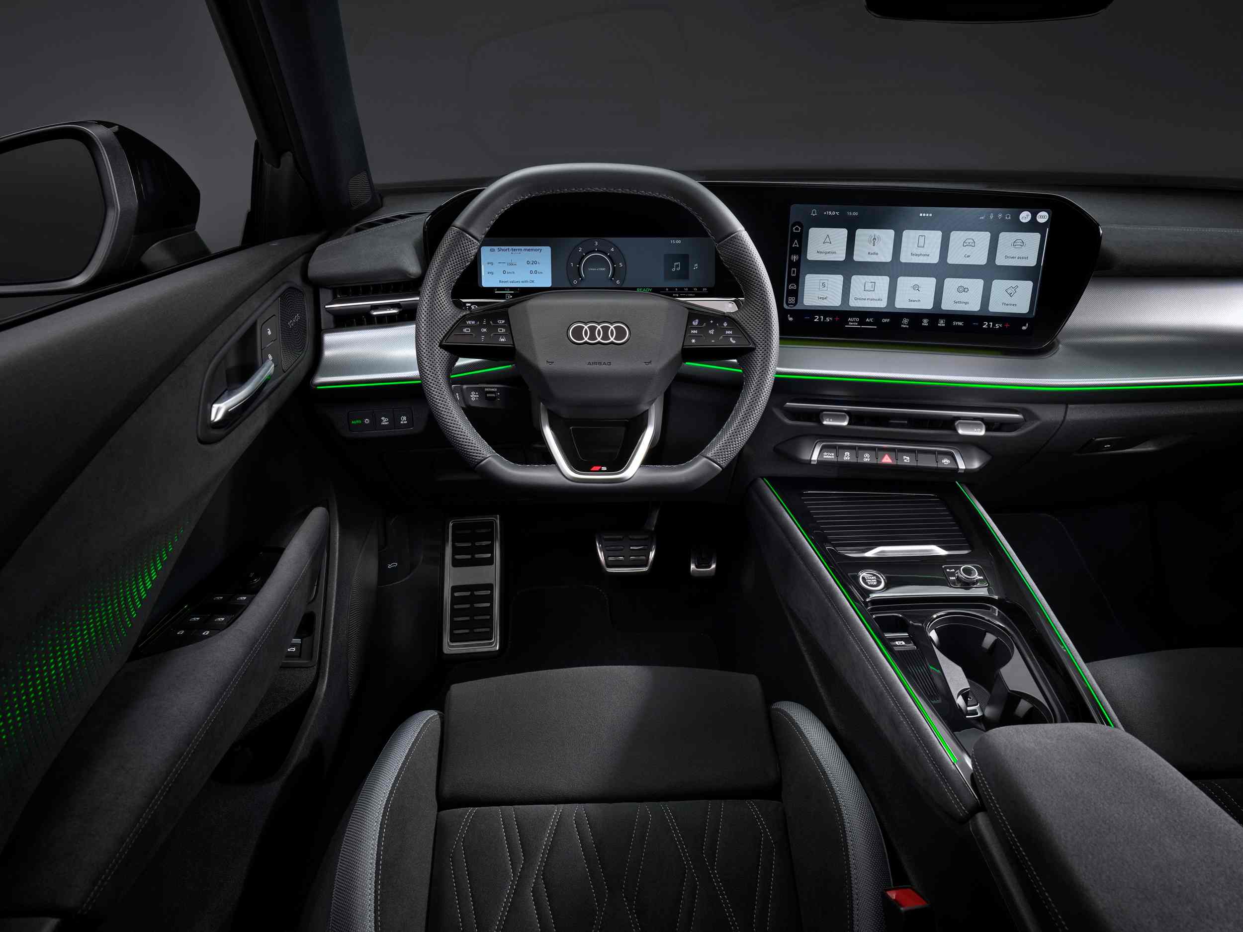 Minimal design, μέγιστη λειτουργικότητα: Το ταμπλό απλώνεται οριζόντια από άκρη σε άκρη, δημιουργώντας αίσθηση ευρυχωρίας. Η λιτή κεντρική κονσόλα εκφράζει τη φιλοσοφία «οπτικής καθαρότητας» της Audi, ενώ το σύνολο διανθίζεται με υλικά υψηλής ποιότητας, απαλές επιφάνειες και λεπτομέρειες χρωμίου. Στο κέντρο της εμπειρίας, η «ψηφιακή σκηνή» με το Audi virtual cockpit plus 11,9’’ και την οθόνη αφής MMI 12,8’’ προσφέρει απόλυτη συνδεσιμότητα, με σχεδίαση που αγκαλιάζει τον οδηγό. To head-up display προβάλλει σημαντικές πληροφορίες απευθείας στο παρμπρίζ.
