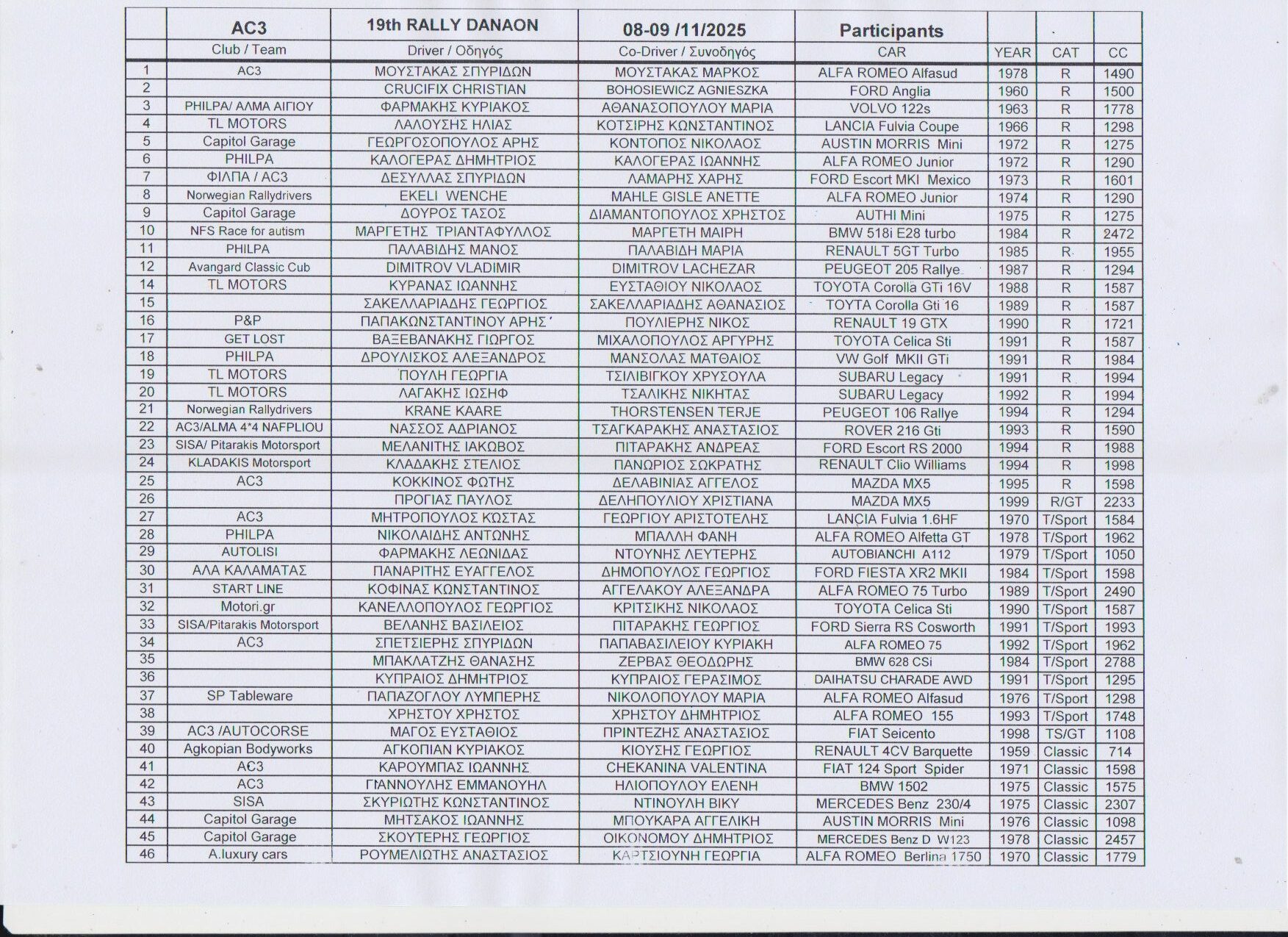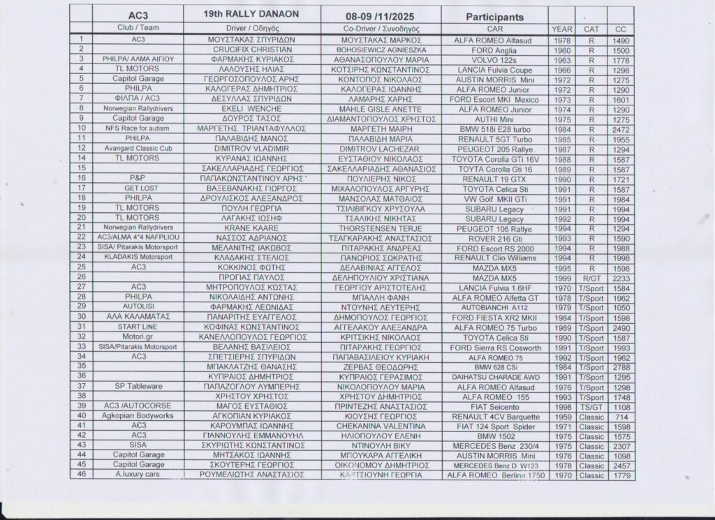 O AC3 (Argolis Classic Car Club) συνδιοργανώνει με τον ΔΗΜΟ Άργους Μυκηνών με επίκεντρο την Αργολίδα, το 19ο ΡΑΛΛΥ ΔΑΝΑΩΝ το Σάββατο 08 και την Κυριακή 09 Νοεμβρίου 2025. Πρόκειται για έναν αγώνα που έχει 45 συμμετοχές, 4 από το εξωτερικό και συγκεκριμένα, από Νορβηγία, Βέλγιο και Βουλγαρία.